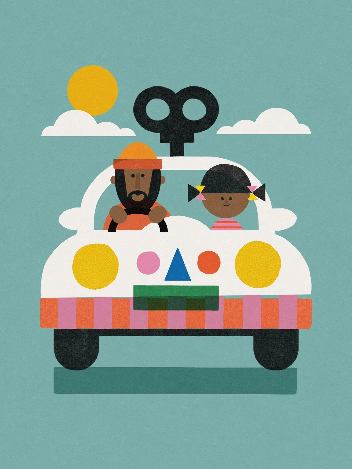 A self initiated print series celebrating the joy of hitting the open road and roaming free. This project is all about life on wheels — from the everyday to the unexpected. A cyclist mid-pedal, a family setting off on a road trip, a chef steering a burger-on-wheels, even the precision thrill of a Formula One car — each illustration explores personality through movement and silhouette.
