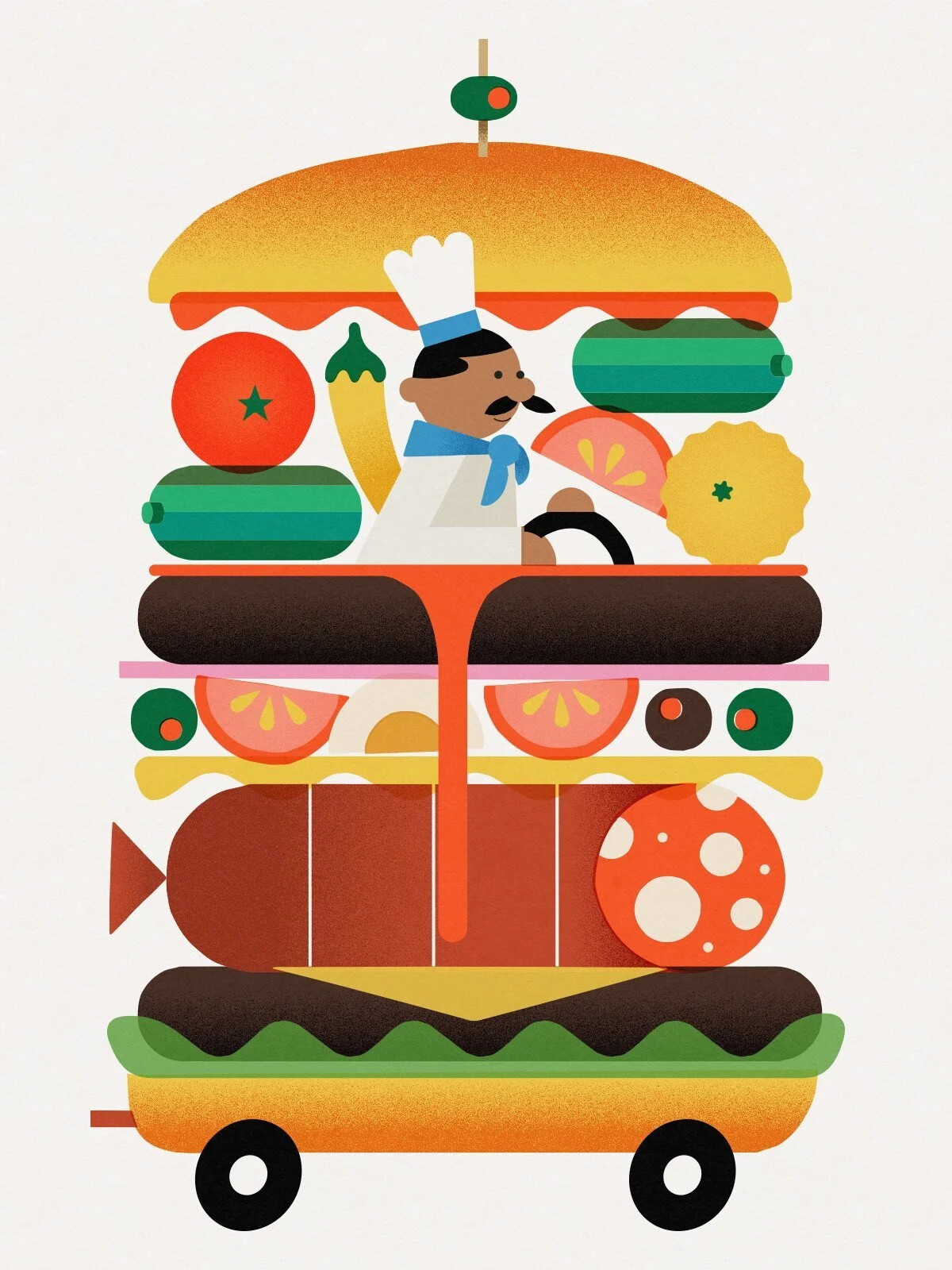 The chug of the mortadella sausage mobile, the crunch of the gravel riding delivery man, and the tick-tock of the wind-up family car, each illustration is designed to capture attention with bold silhouettes and playful forms, and then retain attention by noticing hidden details and unusual stories. Each artwork is made up of individual shapes cut by hand and then assembled into brand new artworks. With every placed piece scanned in, there movement and misaligned elements that only add to the character of each piece bringing the hand of the artist and humanism at every point.